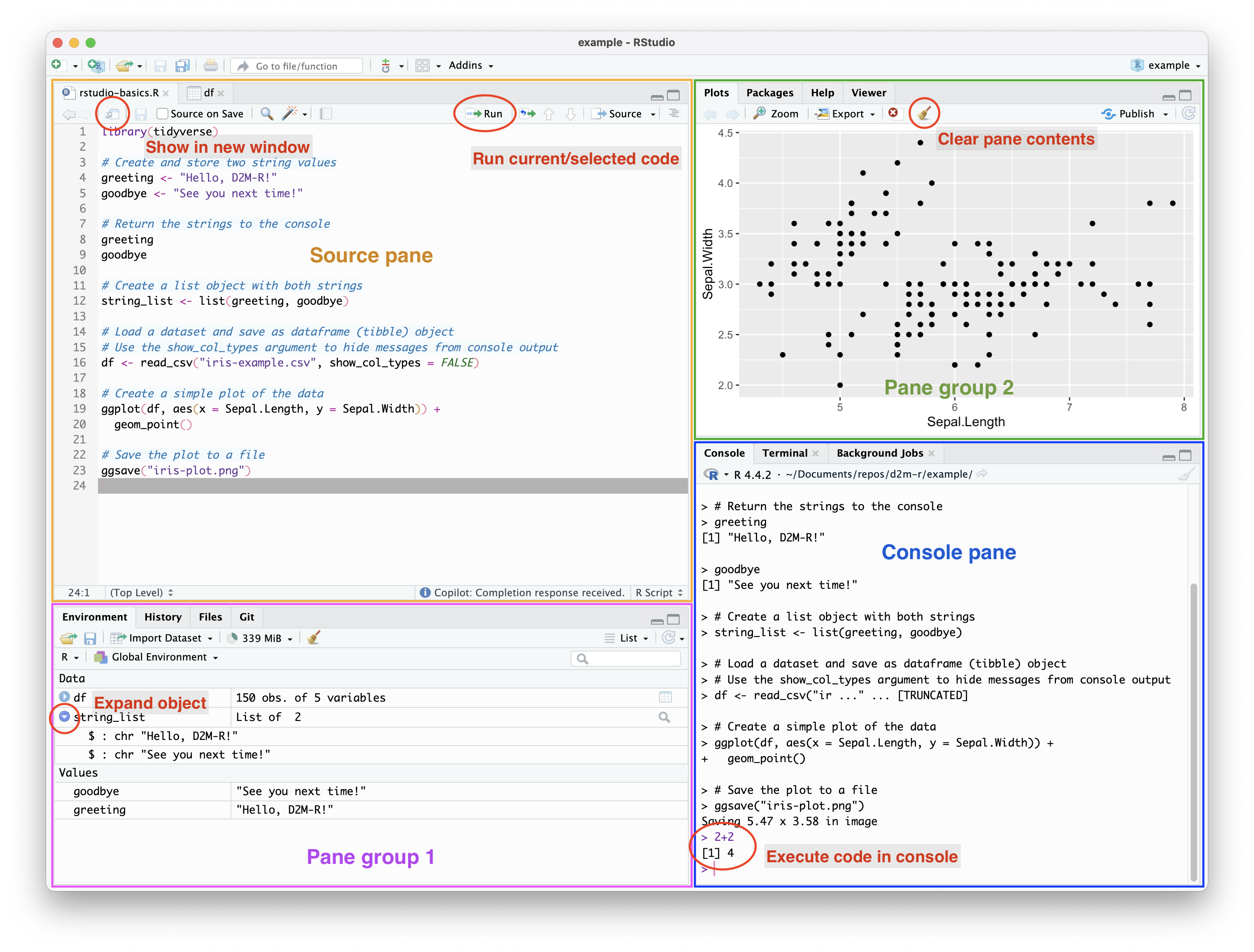 Before we talk details, it’s worth pointing out that many of these panes are just a GUI for R functions that you can (and usually should) run directly in the console or a source script. Can you install and load packages from the packages pane? Yes. Should you? No. You should use the install.packages() and library() functions to keep your project files and code self-contained and reproducible.