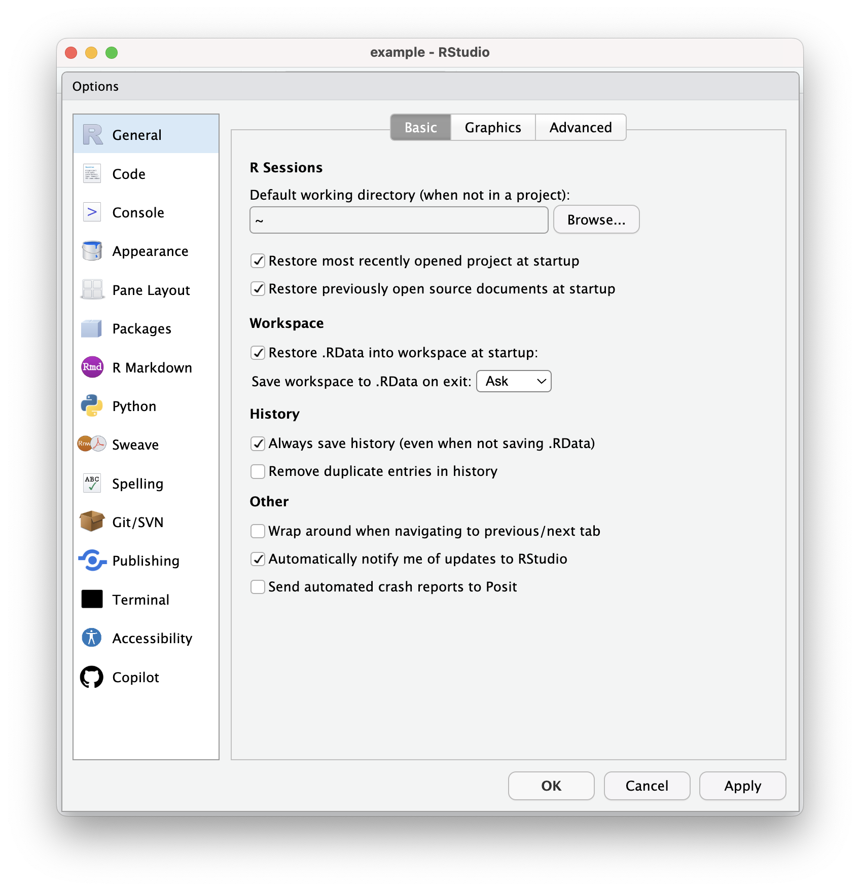 - Working directory: Select a sensible folder to set as your default working directory. By default this will be your home directory (“~” is a stand-in for “/Users/YourName/”). In this class you’ll organize work in R projects, which have their own working directory. I recommend containing those projects (i.e., repositories) in one directory, and setting that as your working directory, e.g., “~/Documents/repos/”.