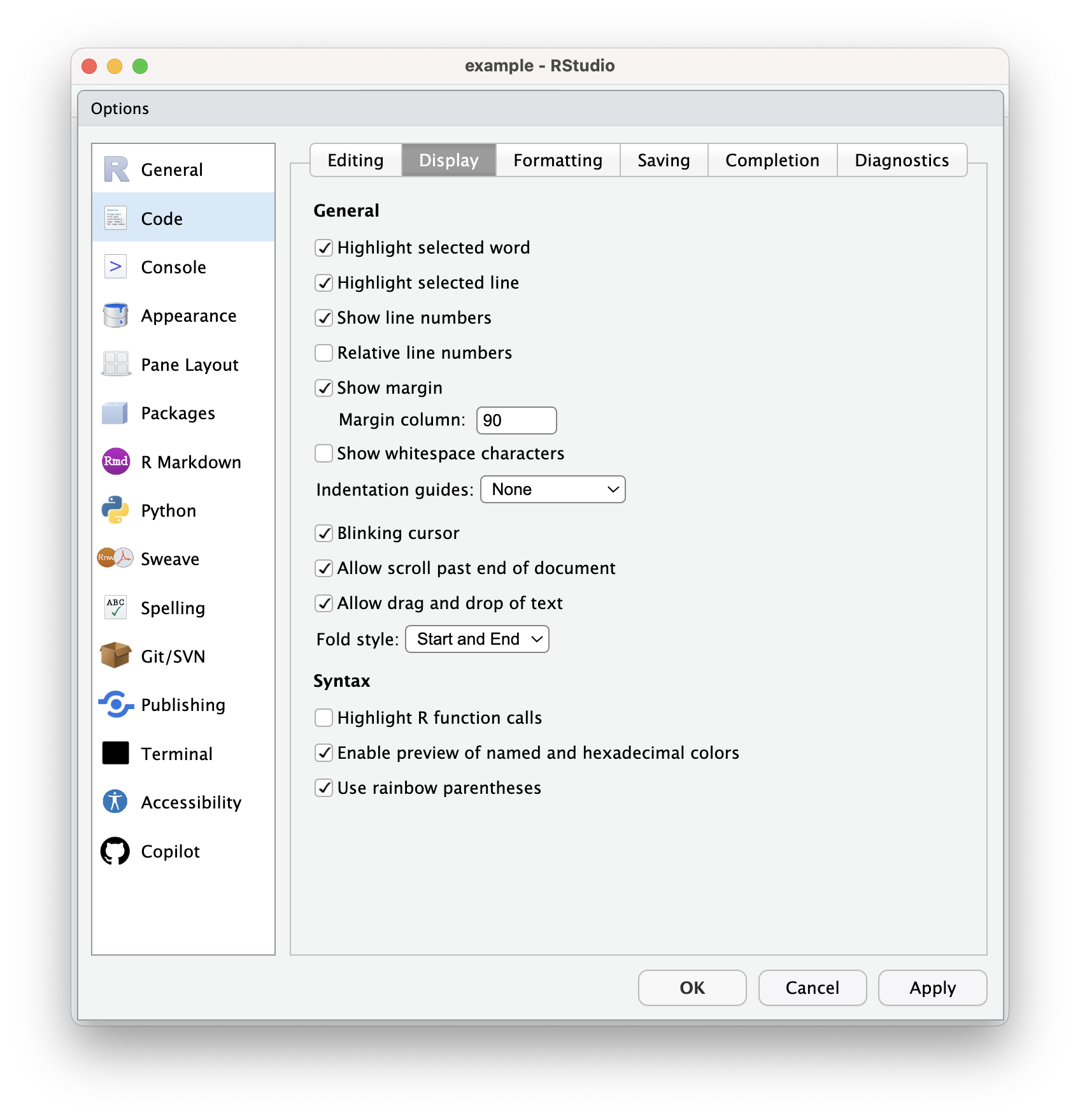 - Show margin: Recall that R is whitespace insensitive, so that you can hit return to start a new line anywhere you could/should insert a space. Markdown is whitespace sensitive, but it is insensitive to single line breaks in regular blocks of text (i.e., not always in all other markdown elements like headings and lists). You can have RStudio display a vertical line to give you a visual cue of a maximum character length for each line. This is completely arbitrary and for readability only, but very handy. It’s especially useful for any documents that will display literal code blocks or other elements that will run beyond normal page margins.