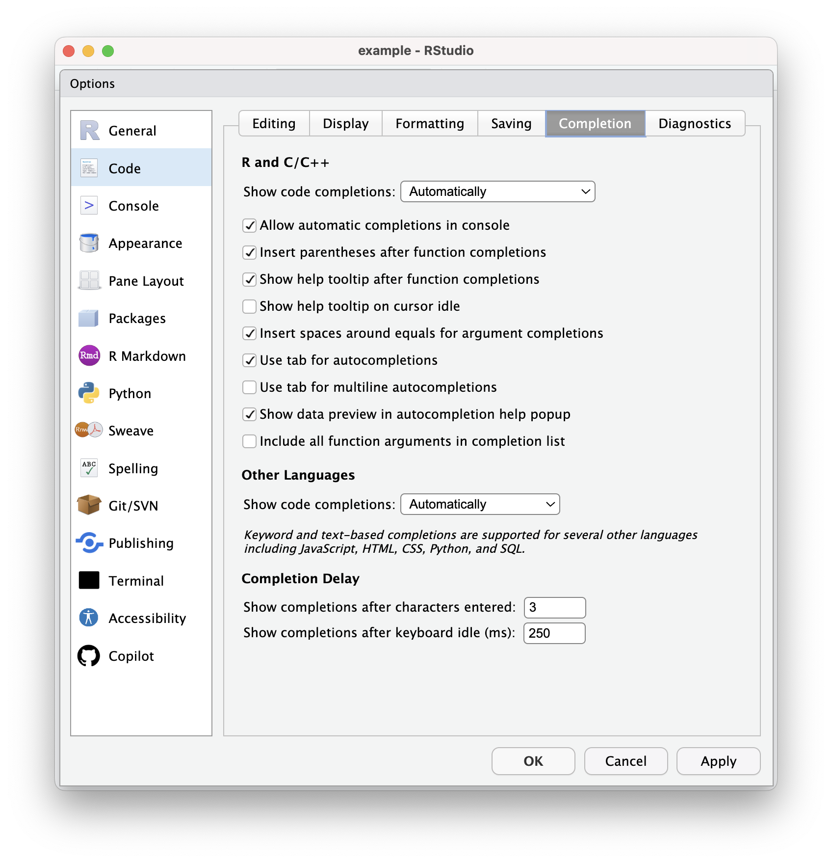 - Tabs or spaces: Whether to use tabs or spaces in programming is an absurd and timeless debate. R is a whitespace-insensitive programming language, meaning any kind of blank characters (both spaces and tabs) are helpful for readability but don’t matter for running the code. Use spaces, use tabs, use nothing (well, use something — human people need to read your code!). It may just be a matter of form rather than function, but you’ll likely develop a preference here. Personally I check the box and use a tab width of 4.