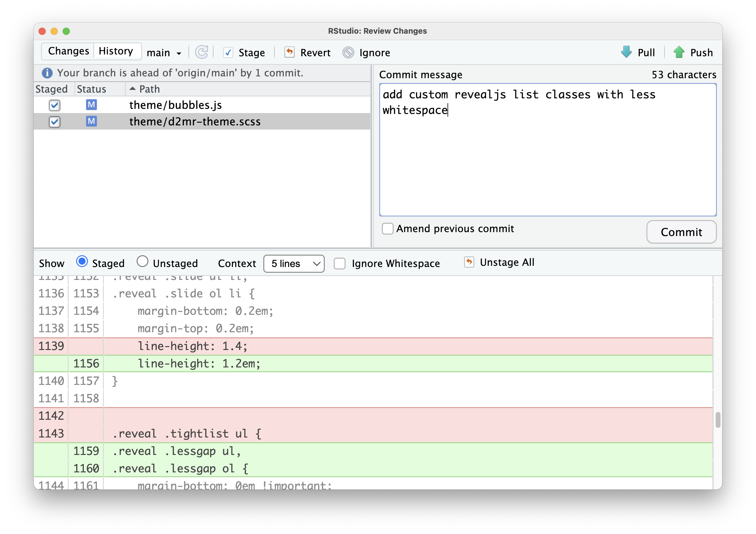 The git pane displays a list of all tracked files in your repo, along with their current status.
