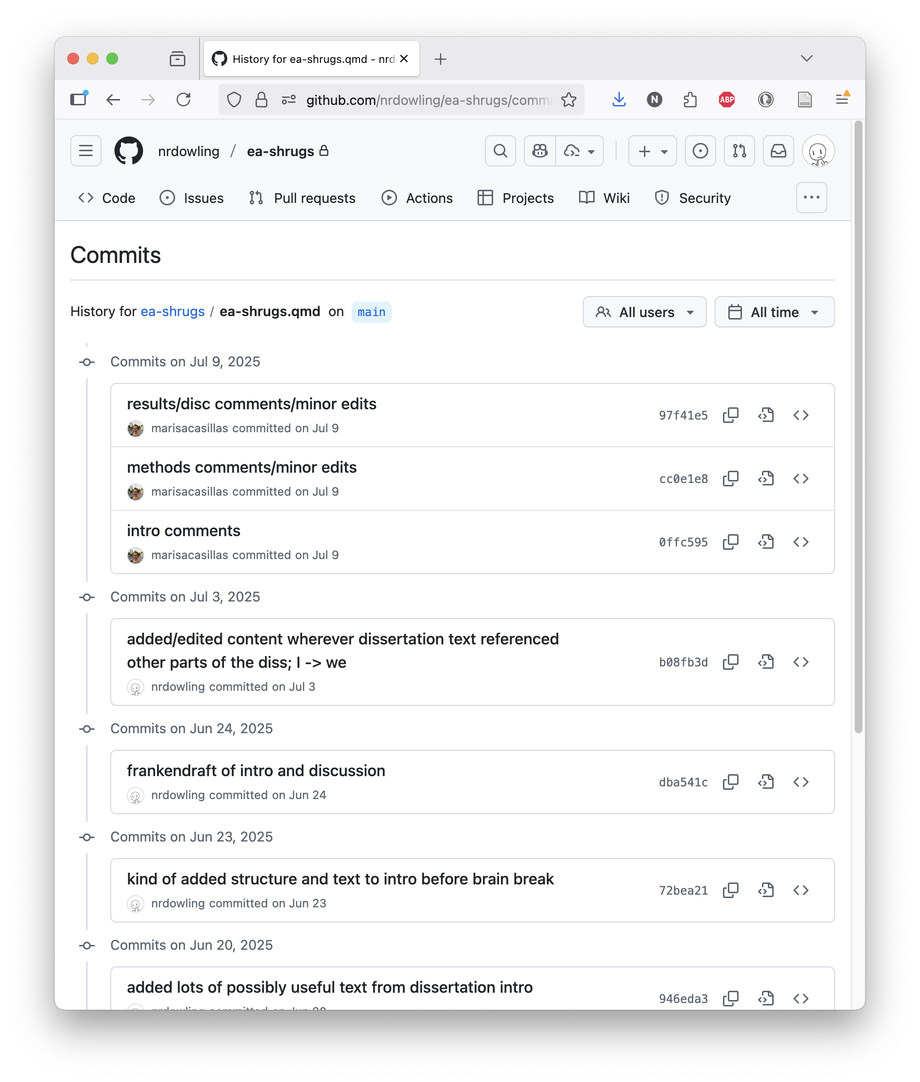 .git/) that Git uses to manage version control.yml options, bibliography files, themes, etc./localonly: only present in your local R Project, listed in your .gitignore and never synced to github/data: .csv/tabular data files for all raw or intermediate datasets read into in your .qmd, optional /raw subfolder for raw data read (only) into unsourced R scripts/source: .R scripts to be called in an early chunk of your .qmd, e.g., stylistic preferences, functions, minor data wrangling/images: exported figures and any image files to read-in to your R Markdown manuscript/_extensions: auto-generated or installed Quarto extensions, like apaquartoREADME.md: project overview, repo structure, to-do list, etc..gitignore: starting from the R .gitignore templateproject-manuscript.qmd: the home of your eventual publication bibliography.bib: a plain-text file containing all the BibTeX entries cited in your manuscriptyourCitationStyle.csl: the script used to format in-text and bibliography citations when knittingA simple, generic project: