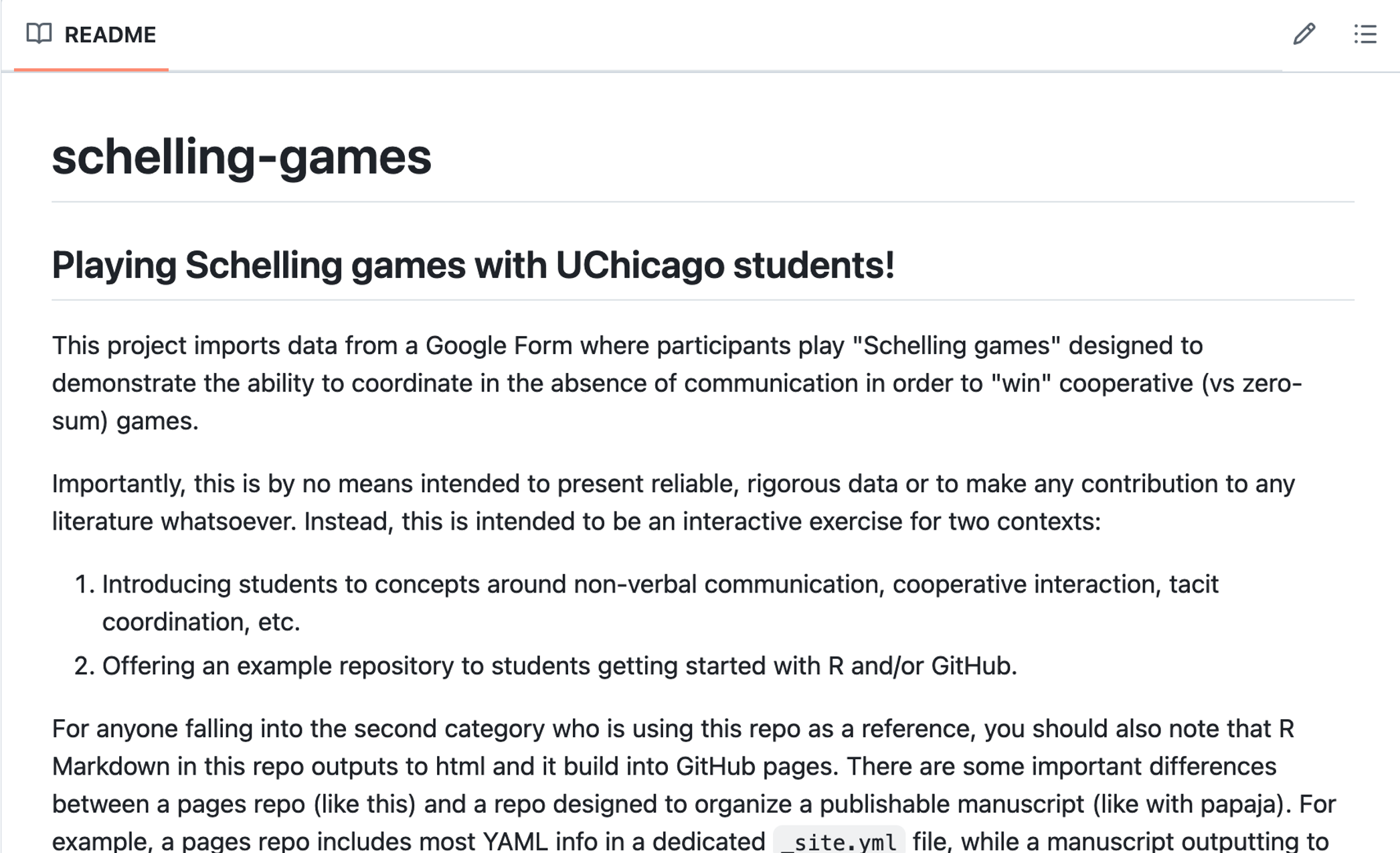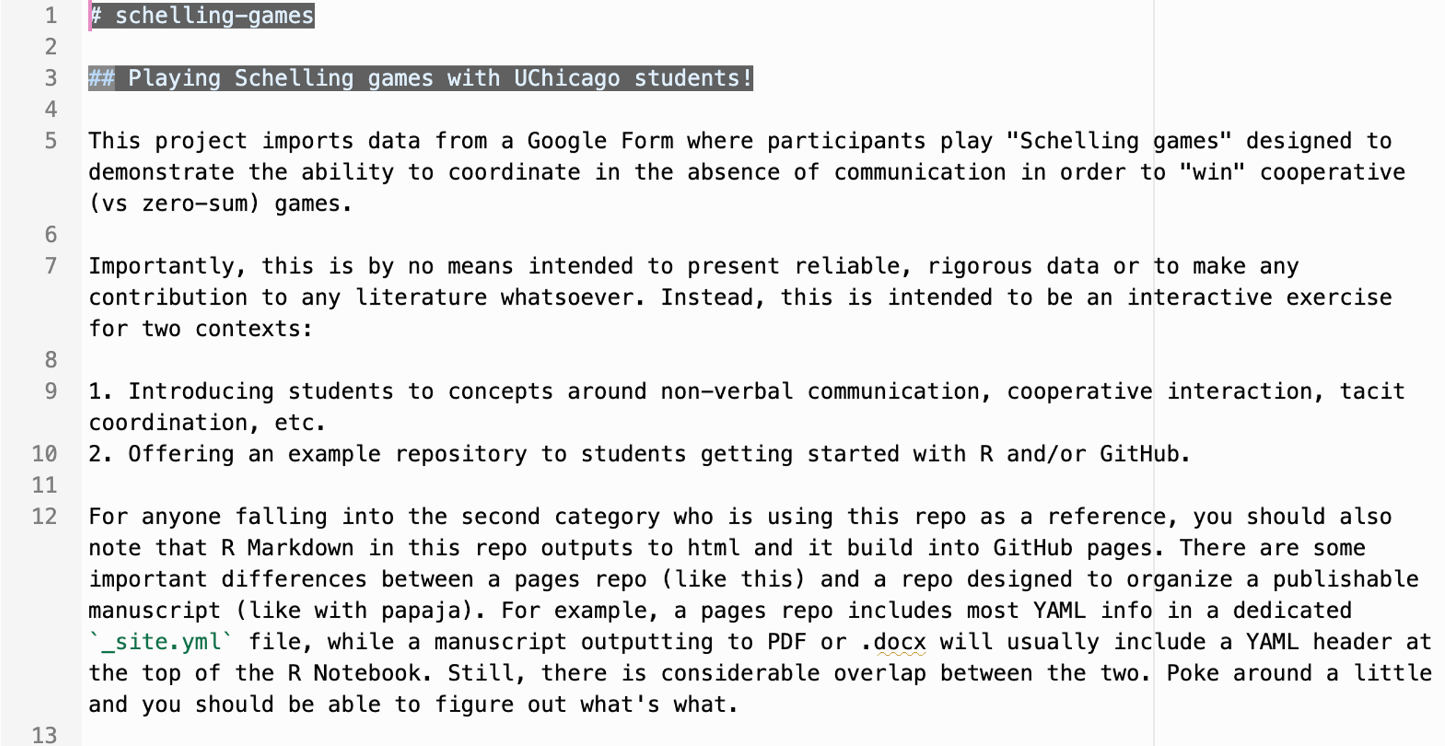 .git/ - Git metadata, what makes Git work.Rproj.user/ - RStudio project settings.quarto/ - Quarto project settings.Rproj.RData.Rhistory.DS_StoreA README.md file provides a project overview. It is typically the first thing someone sees when they visit your repository on GitHub.