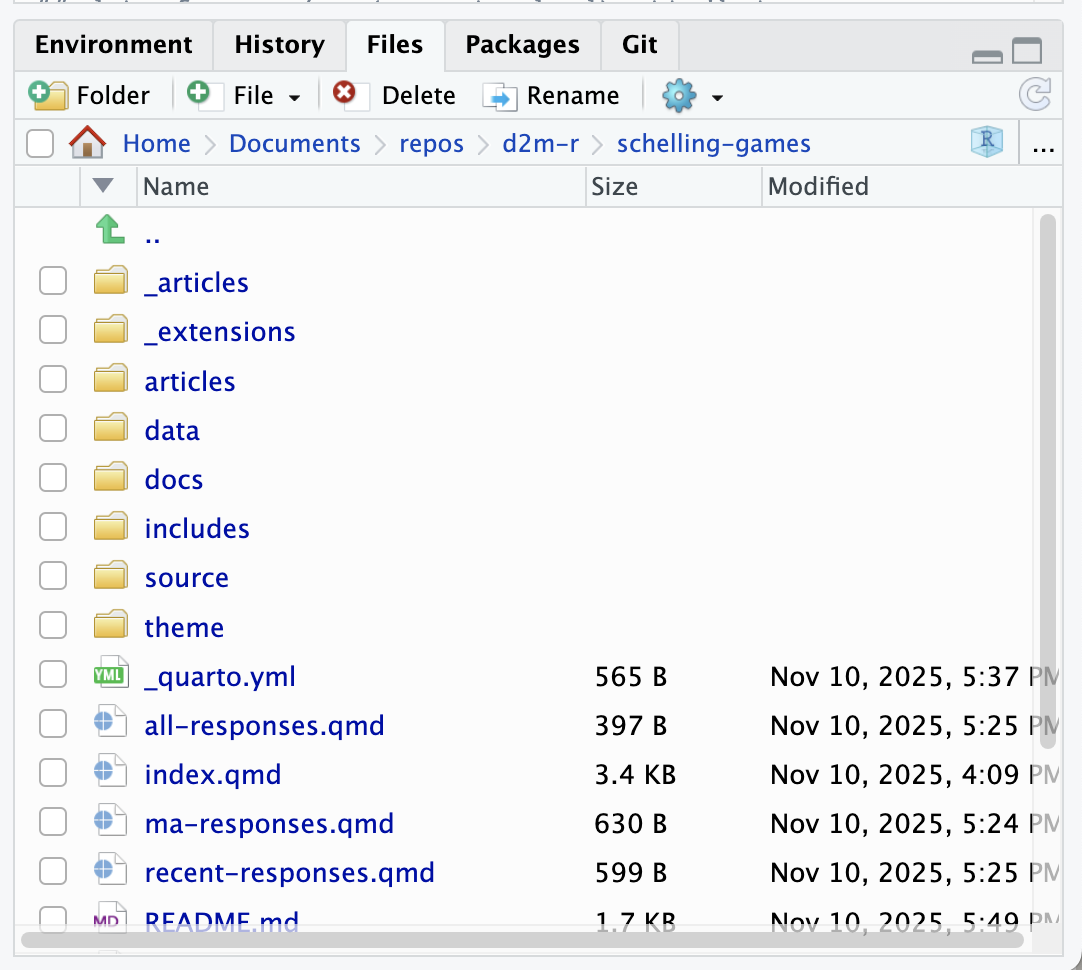 .Rproj): manages project settings.R): contains (only) R code.md): contains (only) formatted text.qmd): contains combination of text, code, and formatting instructionsR Markdown vs. Quarto
